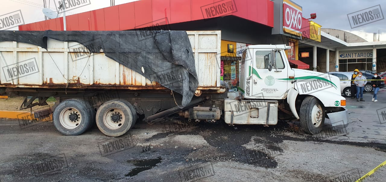 Posteriormente, el camionero impactó la unidad contra la banqueta y muro de la tienda denominada OXXO, donde finalmente pudo frenar.