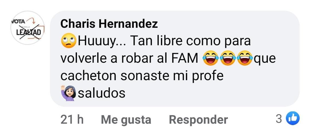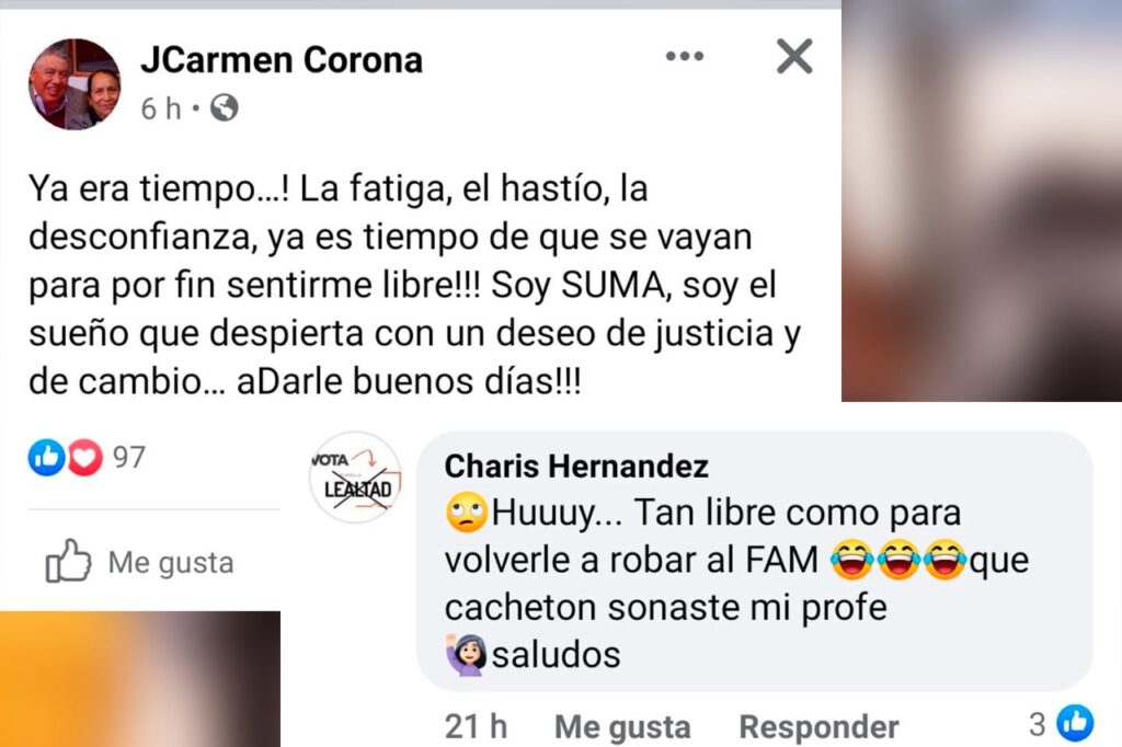 JCarmen Corona en su publicación dice que ¨La fatiga, el hastío, la desconfianza, ya es tiempo de que se vayan para por fin sentirme libre, SOY SUMA¨ por lo que usuarios como Charis Hernández le comentaron: Huy tan libre como para volverle a robar al FAM, que cachetón sonaste mi profe.