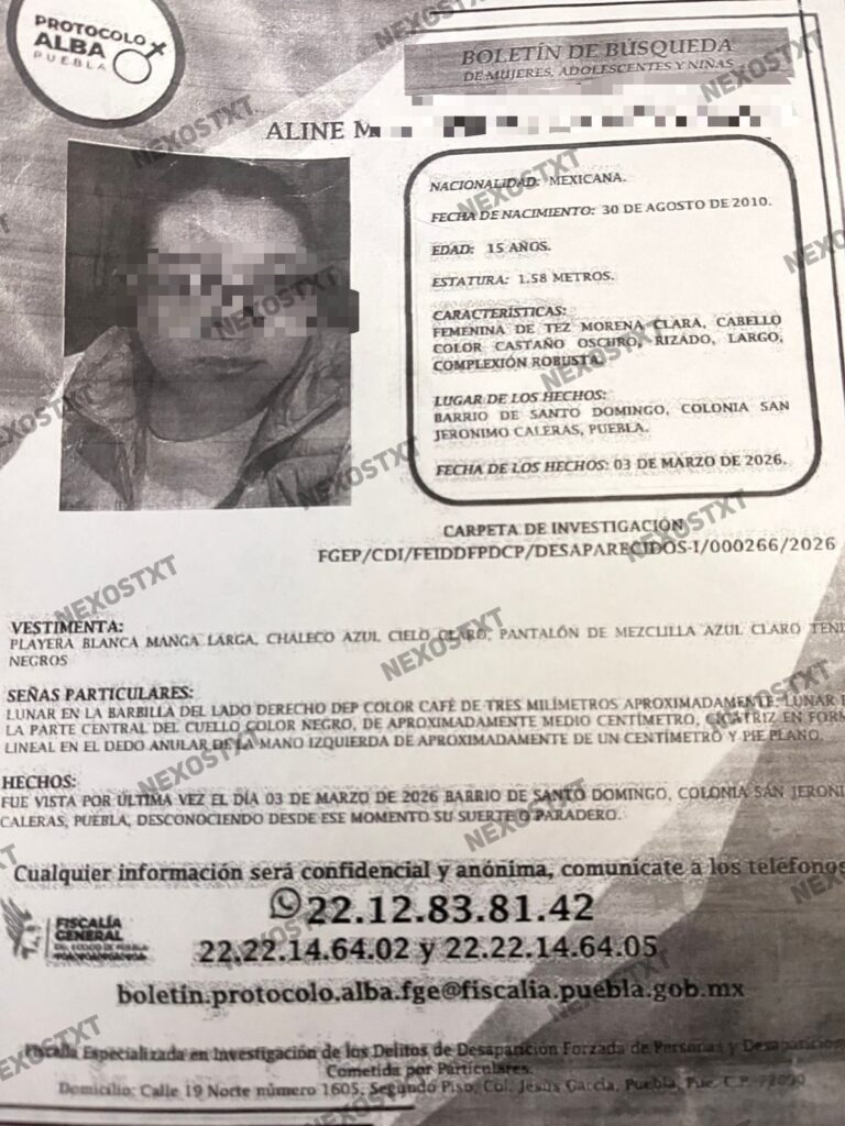 En el documento, se precisó que la menor fue vista por última vez en la colonia San Jerónimo Caleras, Puebla.