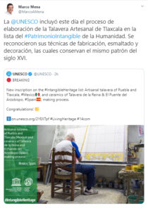 Tras conocer el anuncio, el Gobernador Marco Mena escribió en sus redes sociales que: “La @UNESCO inscribió este día el proceso de elaboración de la Talavera Artesanal de Tlaxcala en la lista del #PatrimonioIntangible Cultural de la Humanidad. Se reconocieron sus técnicas de fabricación, esmaltado y decoración, las cuales conservan el mismo patrón del siglo XVI.