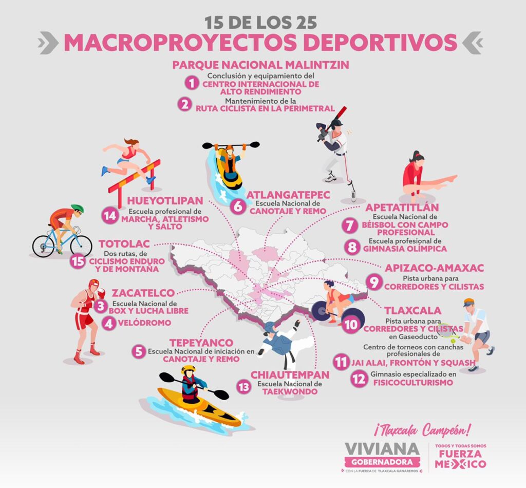 Barbosa Bonola dijo que también tienen contemplada una pista urbana de Santa Anita Huiloac; en gasoducto en el municipio de Tlaxcala, la pista de ciclismo; la ruta perimetral de la Malinche para ciclismo, la escuela de marcha de atletismo y salto para el lado norte de la entidad; el impulso al fisicoculturismo, la organización de frontón y Jai Alai, el tema del centro nacional de squash y la escuela nacional de Tae Kwan Do.