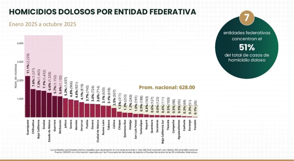 En contraparte, al final del listado se encuentra Yucatán, con 26 homicidios; Durango, con 51 homicidios y Coahuila, con 69 casos, En cuanto a octubre, en Tlaxcala ocurrieron ocho homicidios en el mes.