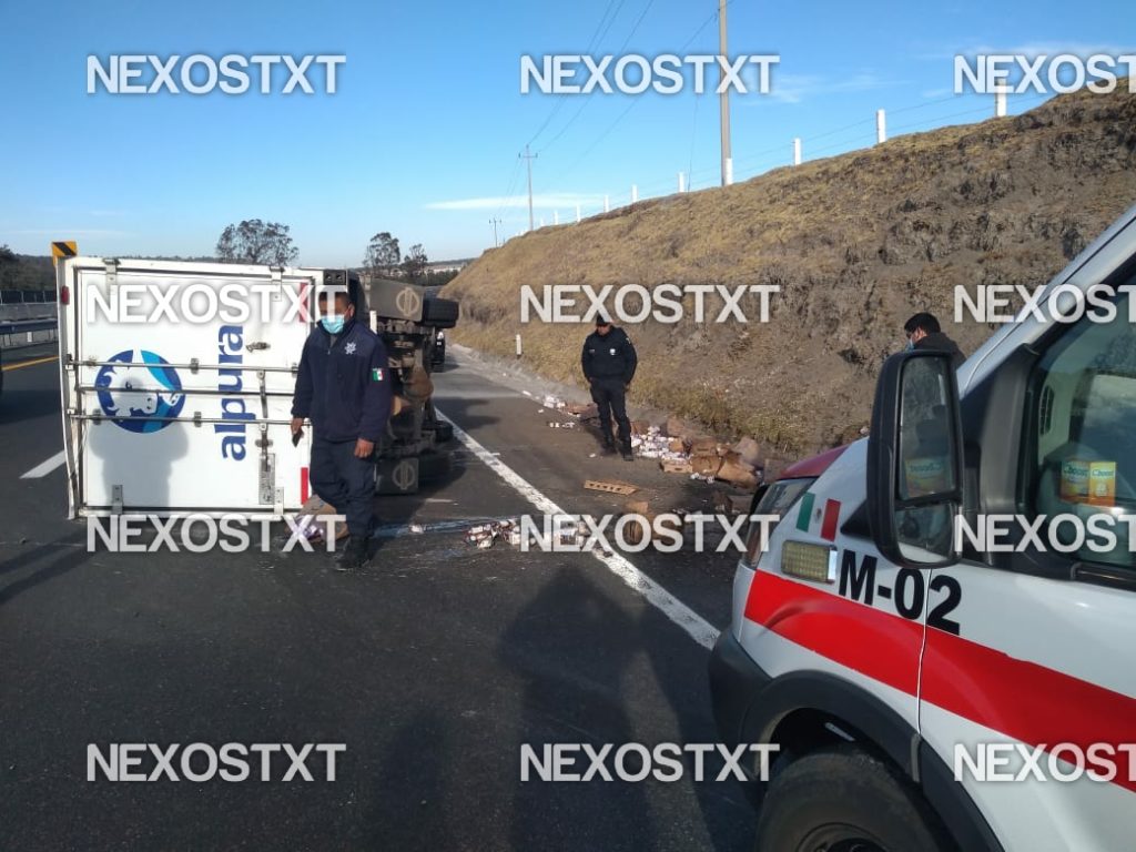 La volcadura de una camioneta propiedad de la empresa “Alpura”, dejó como saldo daños materiales y pérdida total del producto lácteo que era transportado, la mañana de este jueves, en el municipio de Hueyotlipan.