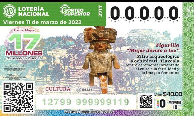 Una figurilla prehispánica de una mujer dando a luz y de fondo la Zona Arqueológica de Xochitécatl, es la imagen plasmada en los 2 millones 400 mil cachitos que se encuentran a la venta en más de 12 mil puntos en toda la República Mexicana y a través de las plataformas oficiales.
